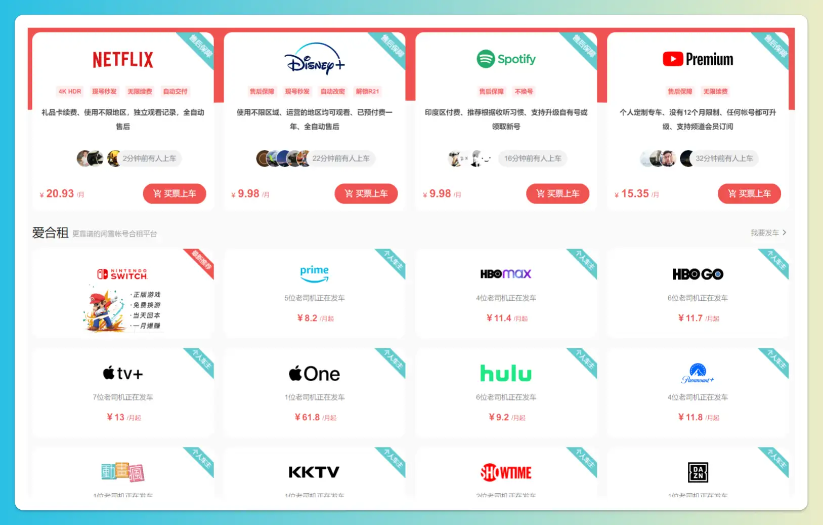 这就是我所要叙述的最重要的一个账号合租方法了,最近这类平台慢慢兴起了很多家,主要就是为大家提供拼车账号。当然我也使用过很多这样的平台进行账号的购买,每个平台的账号价格都会有所不同,但是其稳定性可以得到一个很好的保障。我们可以通过接触绑定微信号,更加直观地查看同一账号的使用情况,这样可以避免一些复杂的事情发生。接下来就给大家介绍几个非常不错的拼车平台,希望对大家能够有所帮助。